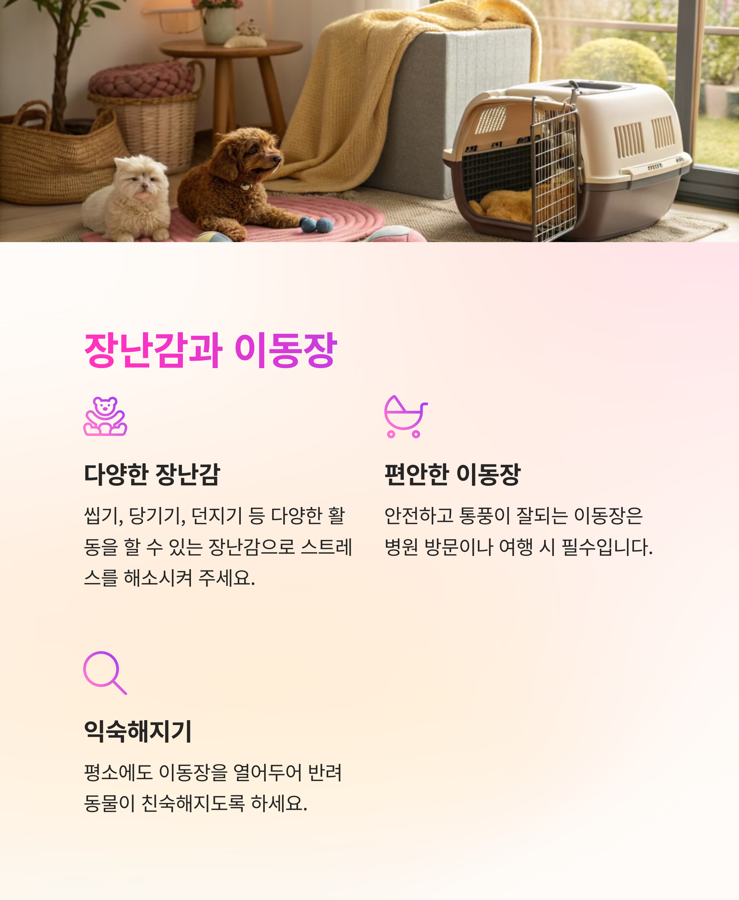 반려동물을 처음 맞이하는 과정은 기대와 설렘이 가득한 순간입니다. 하지만 올바른 용품을 준비하지 않으면 돌봄이 어려워질 수 있습니다. 이 글에서 소개한 필수 용품 리스트를 참고하여 반려동물이 편안하고 행복한 환경에서 지낼 수 있도록 준비해 주세요. 반려동물과 함께하는 매일이 즐겁고 행복하기를 바랍니다!