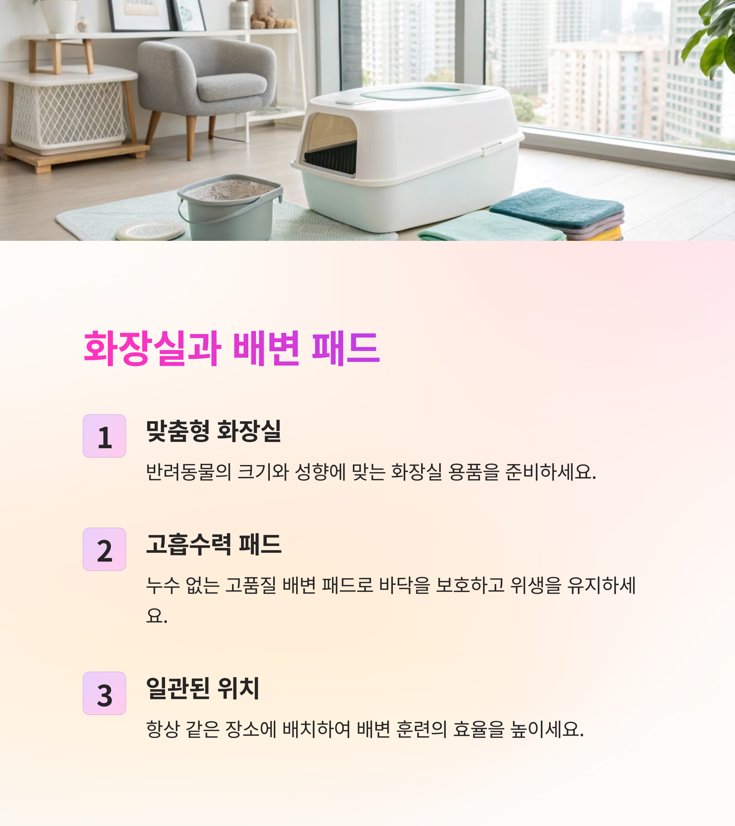 배변 훈련은 일관성이 중요합니다. 특정 장소에서 배변할 때 보상을 주고, 실수했을 때는 혼내지 말고 즉시 적절한 장소로 유도하세요. 강아지는 배변 패드, 고양이는 적절한 화장실 모래를 사용해야 합니다.