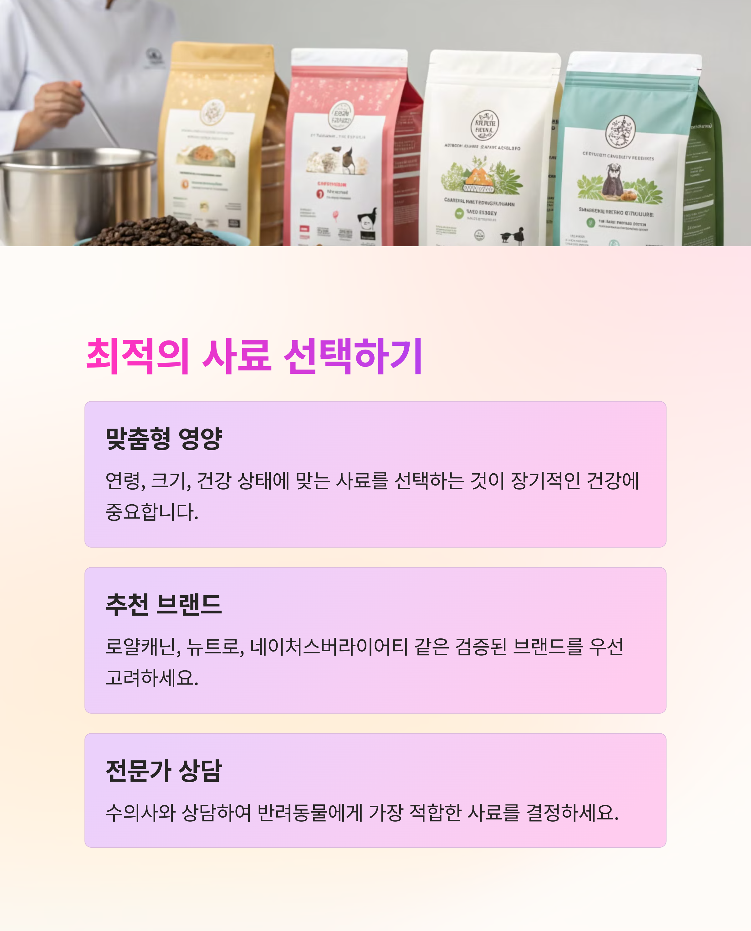 강아지와 고양이의 나이, 건강 상태에 따라 사료를 선택해야 합니다. 로얄캐닌, 네이처스버라이어티, 뉴트로 같은 브랜드는 좋은 영양 균형을 제공합니다. 특히 연령별 사료를 선택하는 것이 중요합니다.